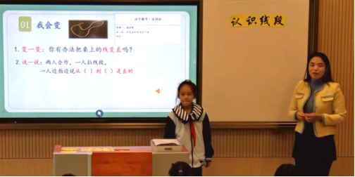 本次活动的第一节展示课《认识线段》由南京市智康路小学的孟晶老师执教。孟老师以中国传统文化中的墨斗切入主题,引出线段。通过环节一,我会变,动手操作·说特征。从学生独立动手操作说特征到同桌合作指特征,学生在经历拉直毛线的过程中,直观感知线段是直直的,当学生想办法将毛线变到黑板时,产生认知冲突,并产生线段要有2个端点的需要,于矛盾冲突中深刻感知线段的端点特征,从而巧妙突破教学难点;环节二我会找,生活辨析·明特征。通过学生自主寻找生活和数学中丰富多样的线段,讨论辨析生活和数学中线段的细微差异,进一步明晰线段的特征,帮助学生建立更丰富更准确的线段表象;环节三我会做、我会连,多样创造·延特征。用圆片变出线段的魔术成功吸引学生开拓思维,做出自己个性化的线段,在你争我比的过程中感受线段的有长有短,随后通过趣味化情境“小鸭和小鸡修路之行”来给学生种下“点动成线、线动成面”的种子,一个个让学生惊叹的视频充分点燃了学生爱上数学知识的火苗,在数学有用更要有趣的感慨中结束本课。
