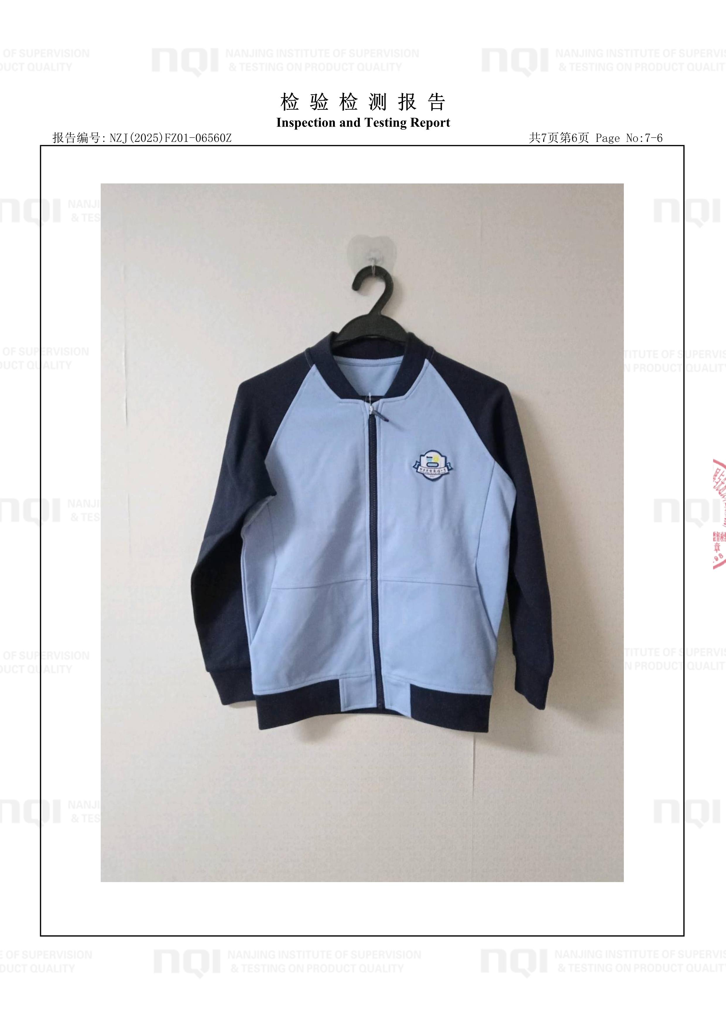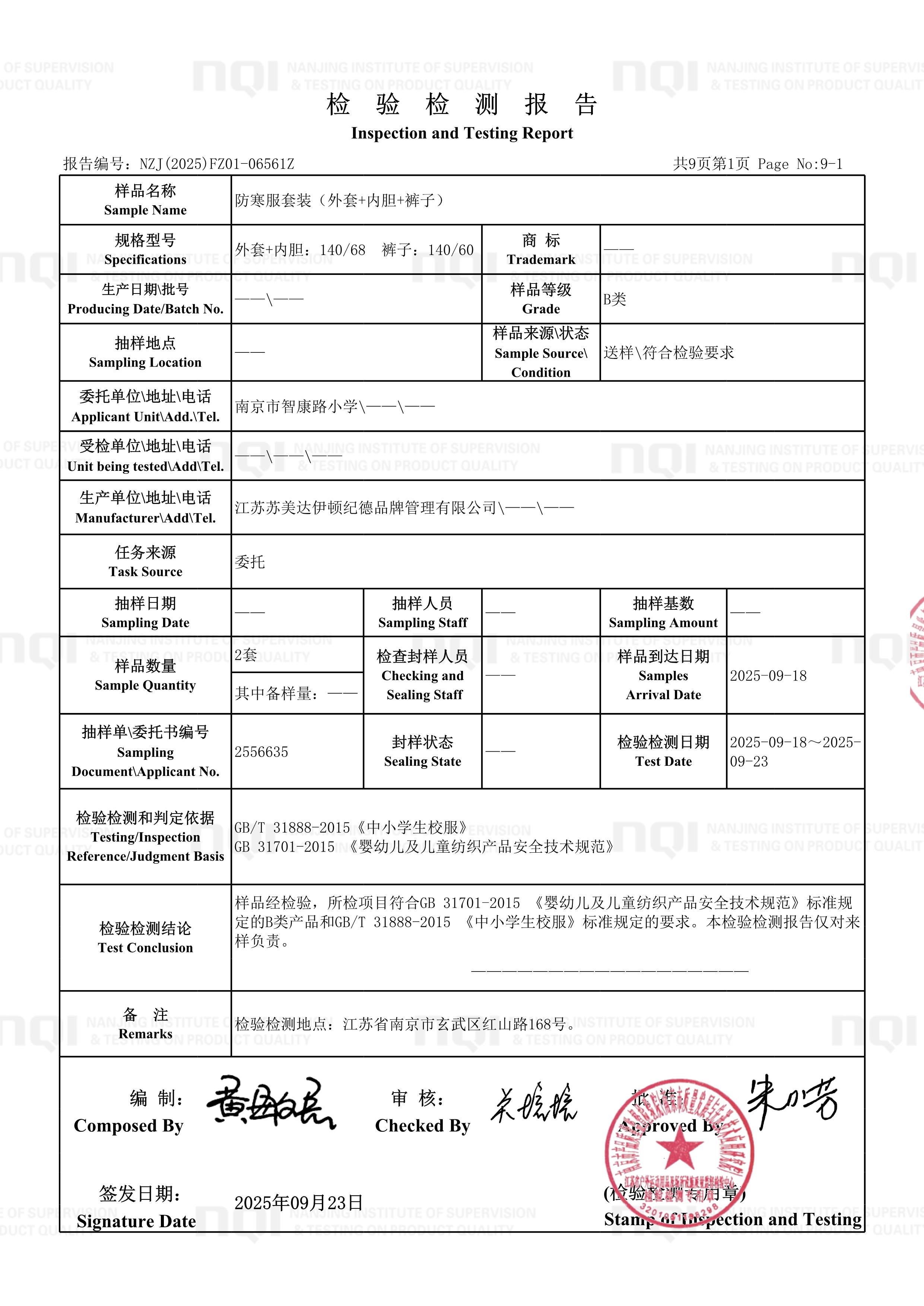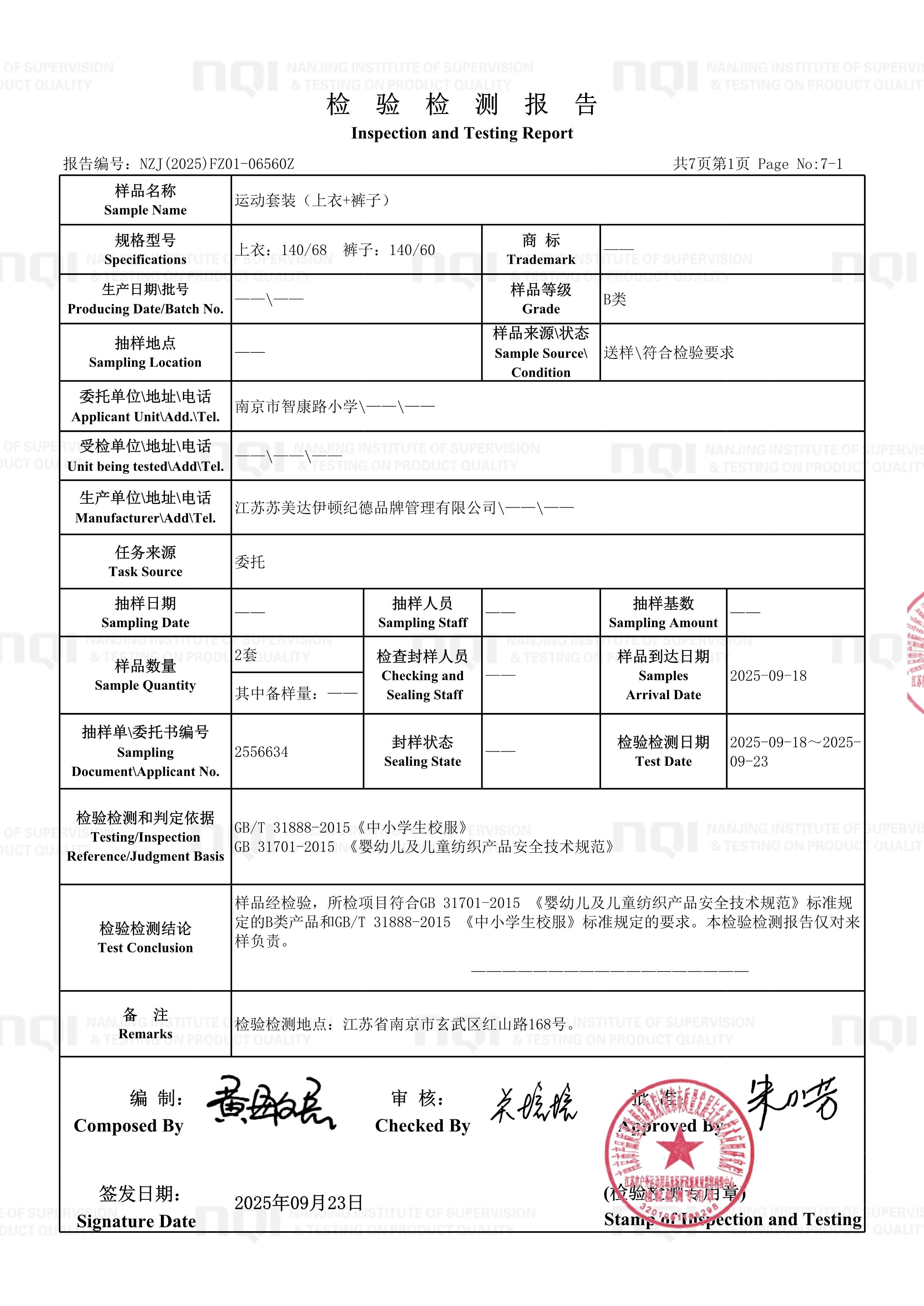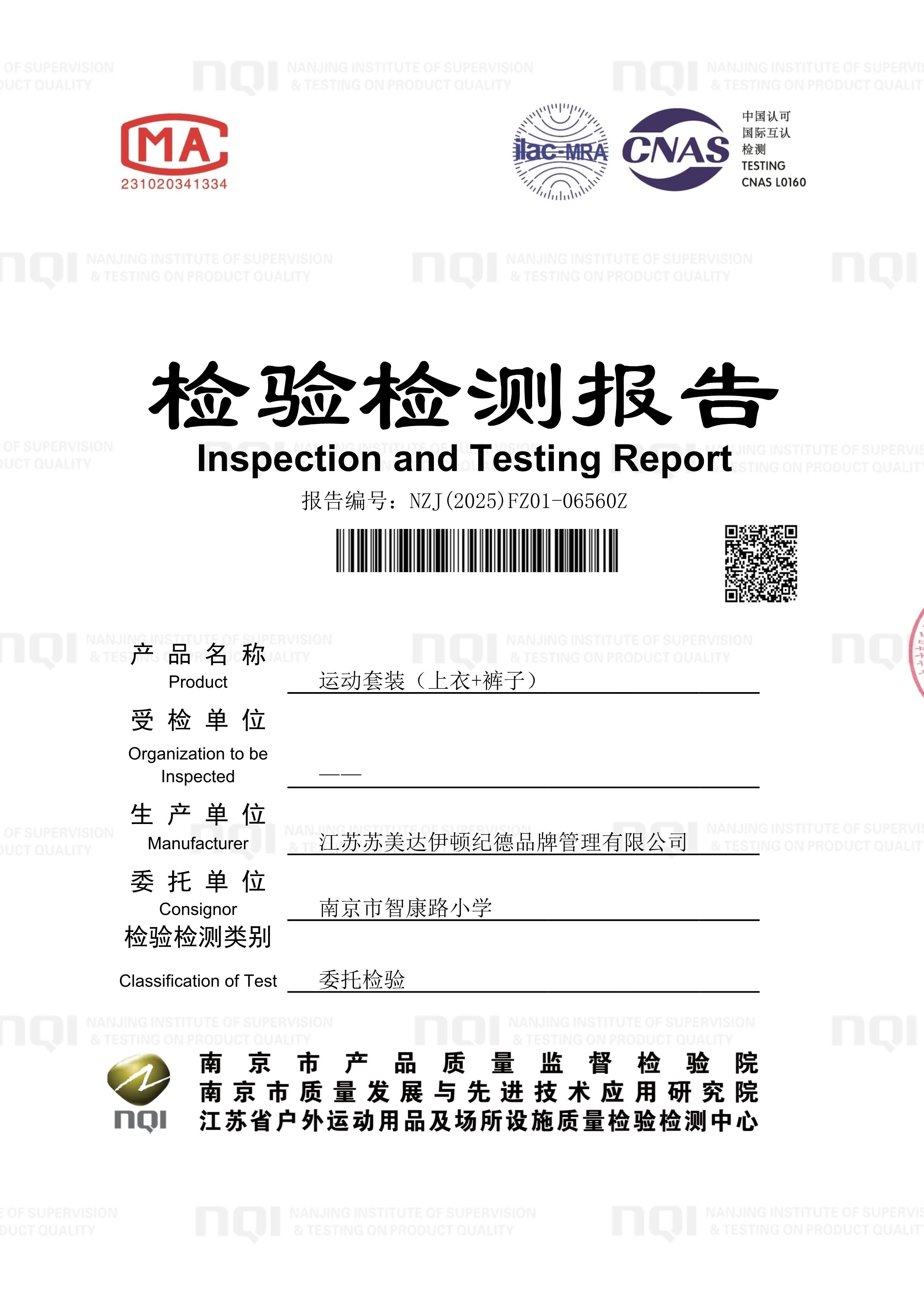 南京市智康路小学2025年9月一年级校服二次检测报告